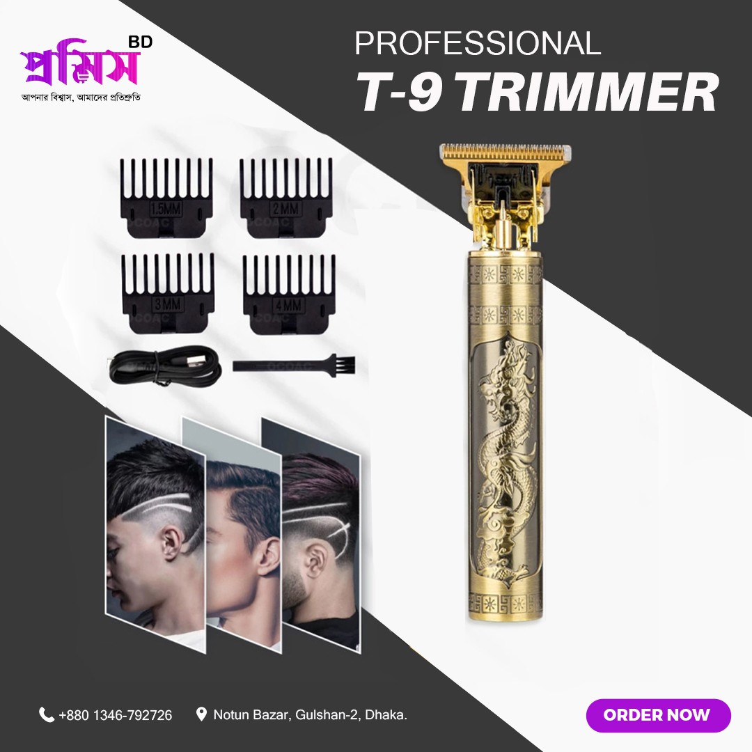 Upgrade your grooming game with the Professional T-9 Trimmer. Designed with a stylish dragon-carved body and powerful motor, this trimmer ensures precision cutting and salon-quality results at home. Comes with 4 guide combs (1.5mm, 2mm, 3mm, 4mm), USB charging cable, and cleaning brush. Perfect for fades, lining, and creative hairstyles. A must-have for men who value both style and performance.